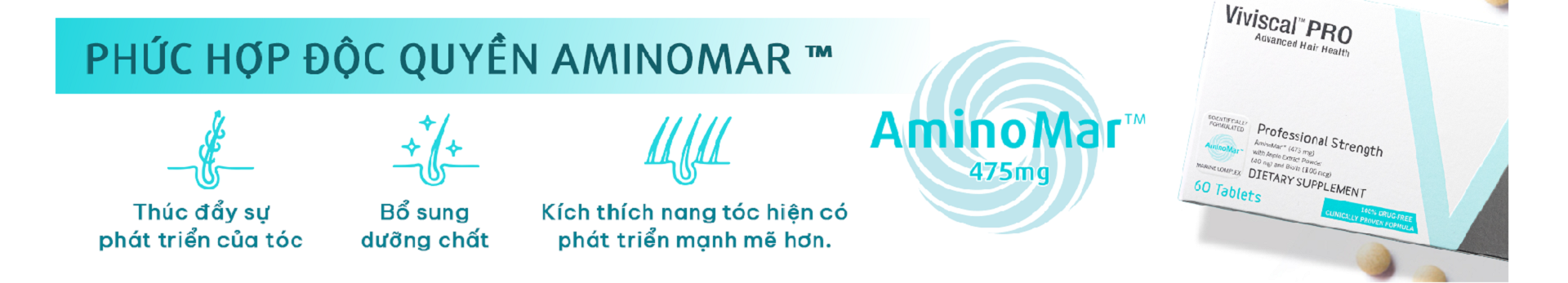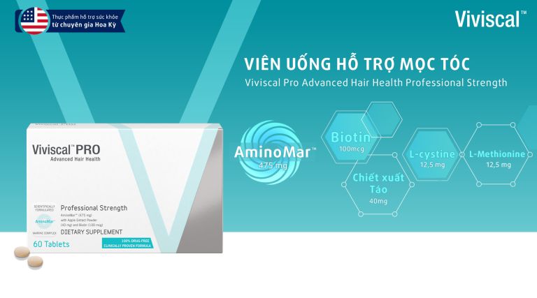 Viên uống Viviscal™ PRO sẽ cung cấp dưỡng chất cho nang tóc từ sâu bên trong và tái sinh mái tóc dễ gãy rụng. Viviscal™ PRO với hợp chất độc quyền chủ đạo là AminoMar™ và các chất dinh dưỡng cần thiết bao gồm Canxi, Biotin, Vitamin C và Chiết xuất Táo (Procyanidin B-2), giúp cải thiện sức khỏe da đầu, củng cố, nuôi dưỡng nang tóc và thúc đẩy mạnh mẽ quá trình mọc tóc tự nhiên.