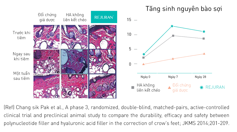 REJURAN® thúc đẩy tăng trưởng tế bào thông qua sự tăng sinh nguyên bào sợi từ đó sản xuất nhiều collagen hơn.