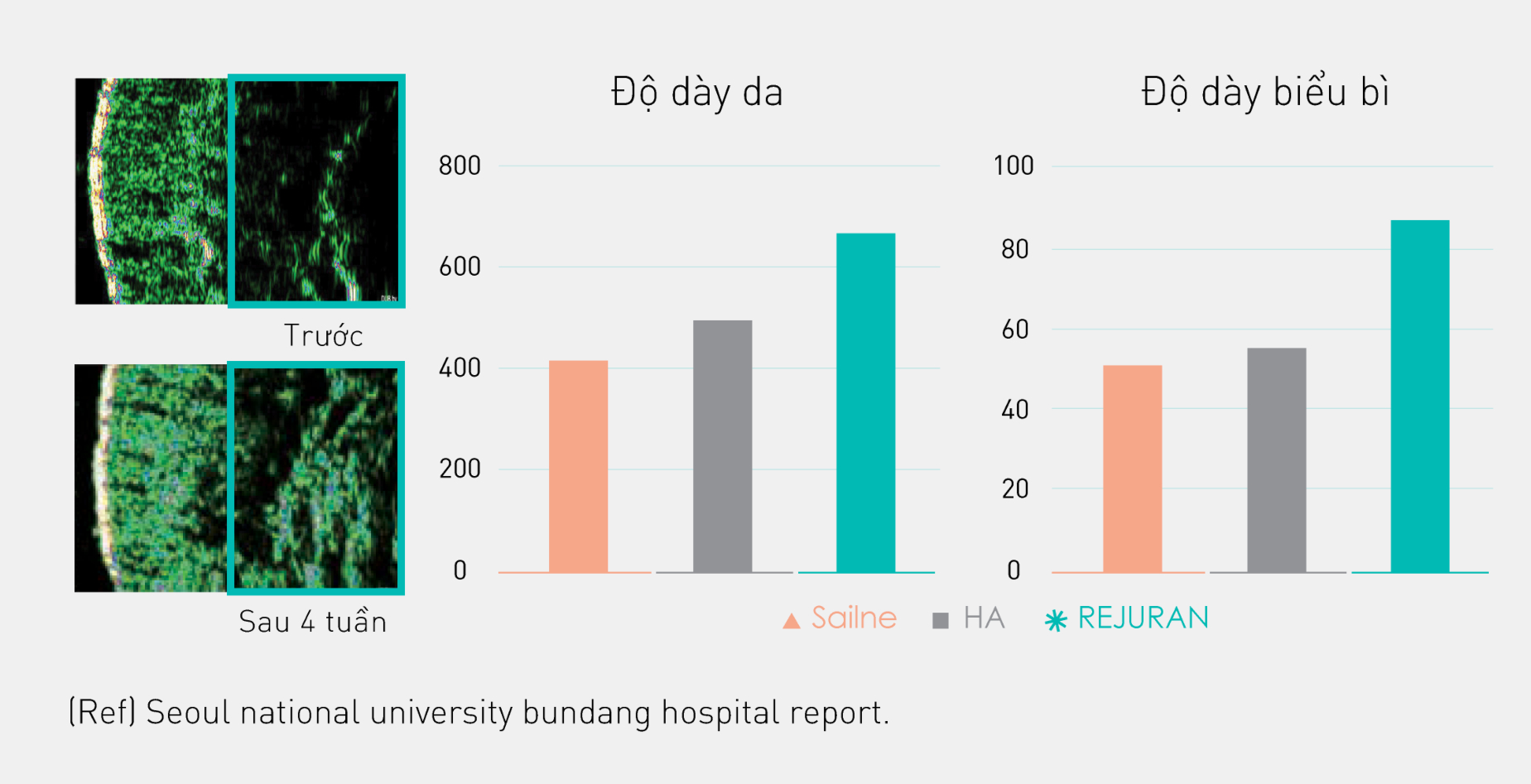 Rejuran® giúp tăng độ dày biểu bì (epidermis) và lớp bì (dermis) củng cố hàng rào bảo vệ da khỏi các tác nhân gây lão hóa da sớm từ môi trường nội sinh và ngoại sinh