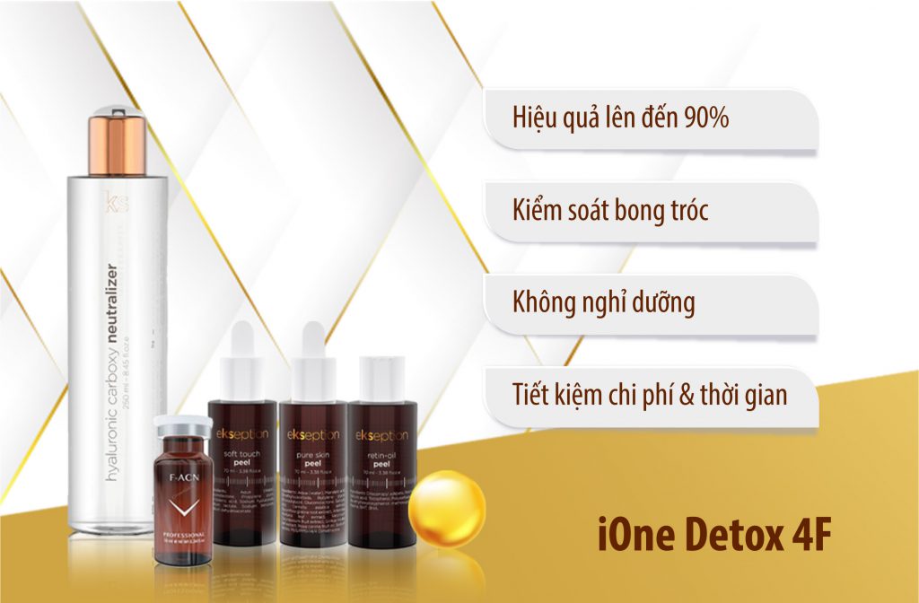 Bên chi phí hợp lý, giải pháp thanh lọc và điều trị tận gốc các loại mụn từ liệu trình iOne Detox 4F ngày càng được tin dùng bởi thành phần sử dụng trong sản phẩm chiết xuất từ trà xanh và acid trái cây, giúp tái tạo sâu triệt tiêu tận gốc các vấn đề mụn. Ngoài ra liệu trình còn mang lại hiệu quả cao, nhưng không yêu cầu máy móc phức tạp, lại dễ dàng thực hiện tại spa. Đặc biệt, liệu trình tuyệt đối an toàn và duy trì hiệu quả lâu dài. Sản phẩm không có alcohol không gây hại cho.